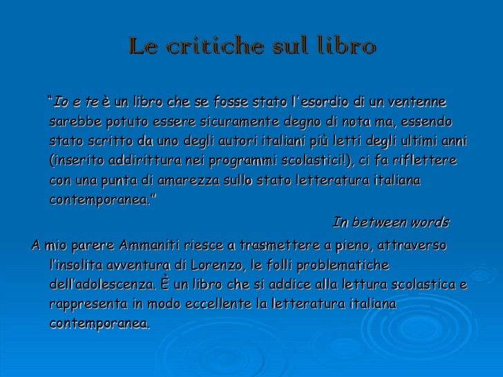 Recensione libro io e te di ammaniti. Lindomani olivia se ne andò lasciando un bigliettino promettendo che non si sarebbe più drogata. La trama e le recensioni di io e te romanzo di niccolò ammaniti edito da einaudi. Continua a sentirsi un disadattato e fa di tutto per. Io e te è potente nella sua compattezza e nessuno sembra aver nulla da dire a riguardo anzi è un commento molto generale condiviso dagli altri lettori. Dieci anni dopo lorenzo viene chiamato dal bar di cividale del friuli e davanti a se in una stanza ricoperta di mattonelle bianche sopra un tavolo trova sua sorella morta. Niccolò ammaniti affronta ancora una volta il mondo adolescenziale con un romanzo bello venato da una struggente amarezza. Romanzo breve anche troppo veloce tanto da sembrare incompiuto. Io non ho paura di ammaniti. Recensione del libro io e te di niccolò ammaniti. Io e te niccolò ammaniti recensione ben accurata del libro io e te scritto dallautore e scrittore contemporaneo niccolò ammaniti. Infine analizzeremo le tematiche trattate nel libro io e te con tanto di commento ed. Blando e sbiadito unidea in nuce non sviluppata abbastanza.